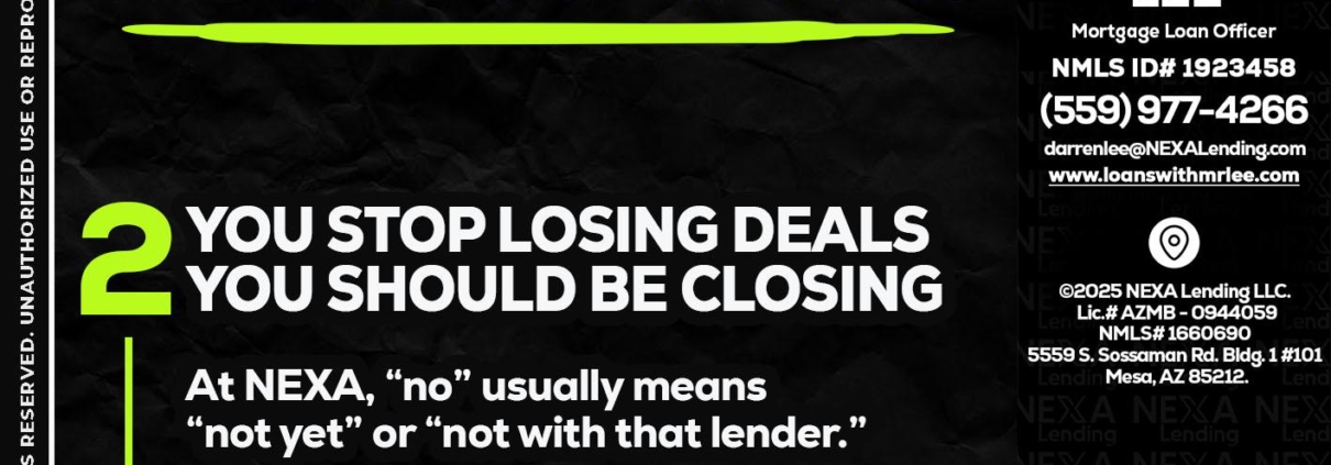 Hi, my name is Darren Lee. I’m a Loan Officer with NEXA Lending LLC., offering personalized mortgage solutions, fast customized quotes, great rates and service with integrity.