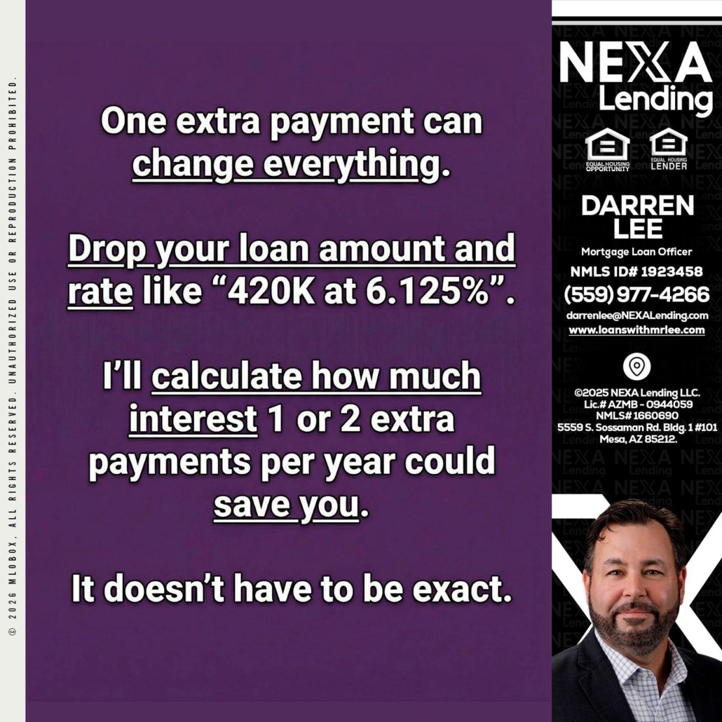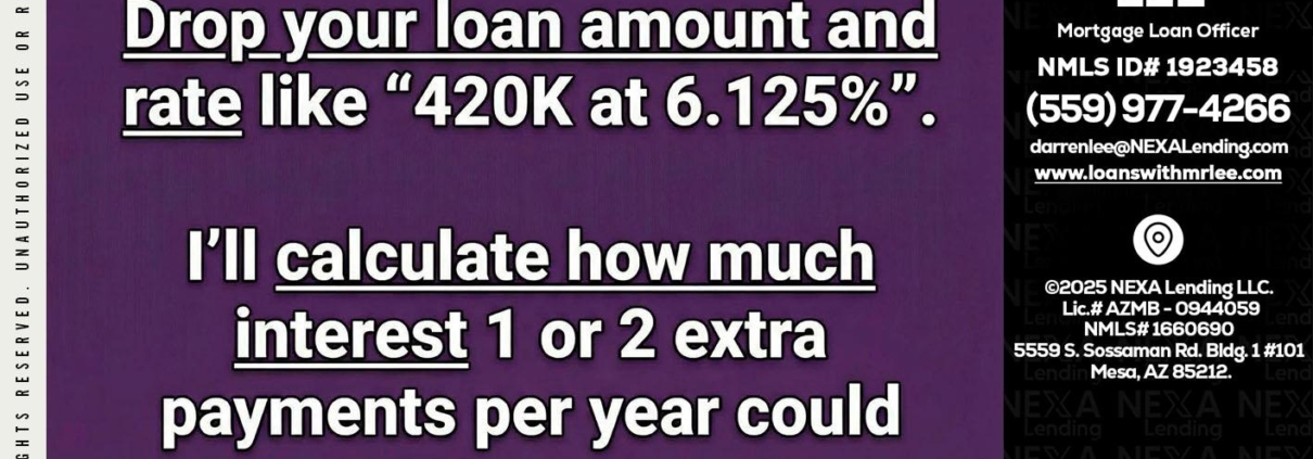 ONE EXTRA - Darren Lee -Mortgage Loan OfficerHi, my name is Darren Lee. I’m a Loan Officer with NEXA Lending LLC., offering personalized mortgage solutions, fast customized quotes, great rates and service with integrity.