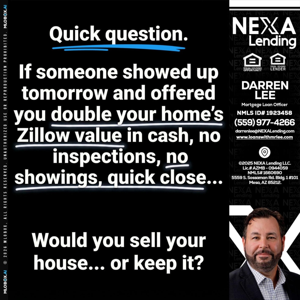QUICK QUESTION - Darren Lee -Mortgage Loan OfficerHi, my name is Darren Lee. I’m a Loan Officer with NEXA Lending LLC., offering personalized mortgage solutions, fast customized quotes, great rates and service with integrity.